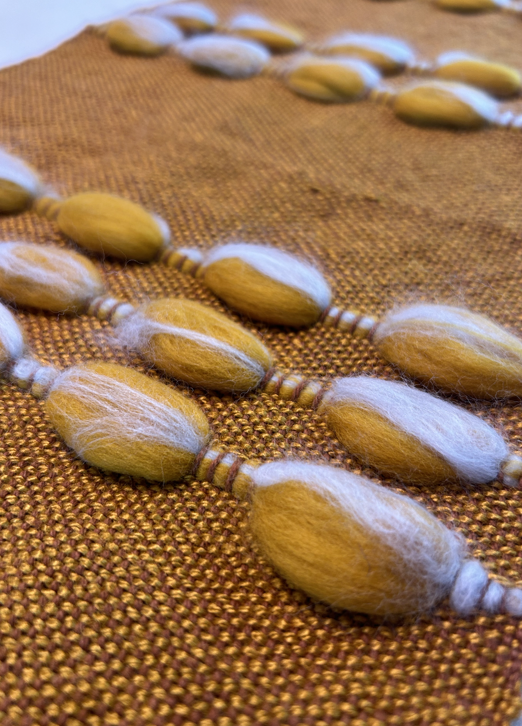 “Sand Dunes” aims to reimagine existing techniques related to weaving on a loom. Playing with various options and techniques to create texture and contrast throughout the design. As a designer I’ve had experience with weaving on looms and have been inspired by the range of possibilities and creative opportunities involved with weaving. With knowledge and experience of adding wool fibres into a weave to create an embellishment of colour or textural contrast, I wanted to expand on this idea and create a swatch which pushed these boundaries. The method to create the bubbly texture in the scarf was achieved by alternating between weaving with thread and wool fibres (which were weaved through the warp individually to create a bubble effect). Not only does this design create a visually appealing garment it also is very functional as it provides warmth to the wearer of the scarf. For this final project the design and layout of this scarf was explored to make the design unique to this range, therefore the alternating 2 to 3 bubble rows were used. The materials used in this design are all-natural linking to the concept of sustainability and being conscious about the materials sourced in the design. However, this process requires a lot of concentration and skill to ensure the fibres are placed correctly through the loom making the craft more complex which could increase the price of the garment. The name ‘Sand Dunes’ related to the Australian coastal landscape, reflects my connection to the land as an Australian designer.