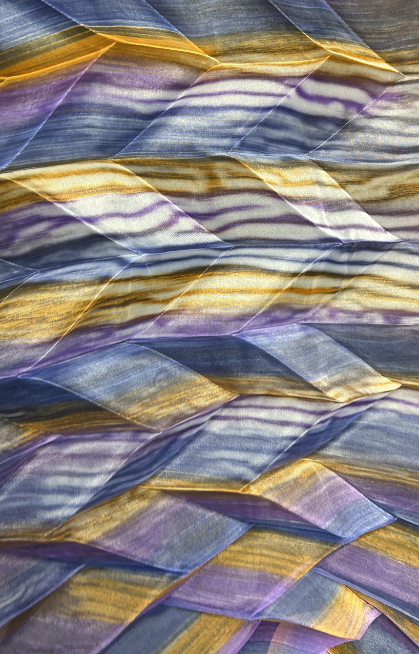“Mountains and Valleys” explores the opportunities between the relationship of traditional origami folding techniques and thermoplastic design properties. The design of this textured layout was inspired by Akira Isogawa's Japanese heritage and cultural fusion within his work, using traditional origami techniques called mountains and valleys. Originally, the swatch was created on a cotton fabric and the fold lines were made through laser cut etches. However this was unsuccessful in achieving the desired aesthetic for this collaboration. Therefore, experimentation into the opportunities to combine sublimation printing and thermoplastic heat sets were explored and resulted in this outcome. The idea of this design was to avoid the use of synthetic fibres and materials however in order to achieve this aesthetic and function polyester fabric was required. However, to still adhere to these goals and sustainable design practices the scarf uses recycled polyester to extend the lifespan of the fabric. Additionally, the use of sublimation printing was very successful in uniting the collection through colour. The ability to have freedom within the design space to hand paint the desired pattern was really effective for the desired look. This technique was very cost effective to produce, which would assist in making it more accessible to consumers making the production and design more ethically conscious. Furthermore, the name ‘Mountains and Valleys” correlates to the Australian landscape, reflecting my connection to the land as an Australian designer.